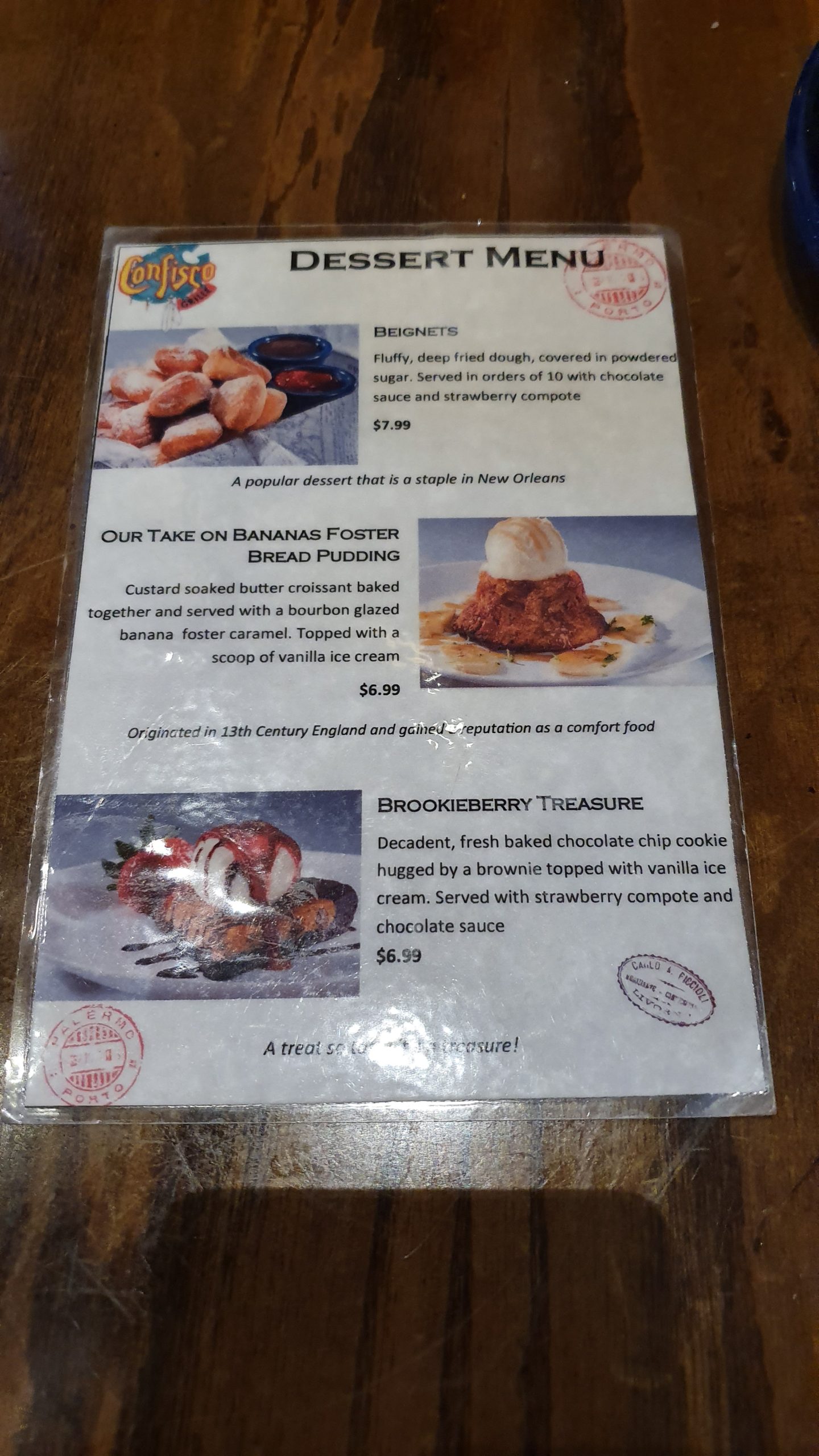 Only three offerings are on the desert menu. After our meal we were too full to try any of them but the Bananas Foster Bread Pudding would of been my choice.