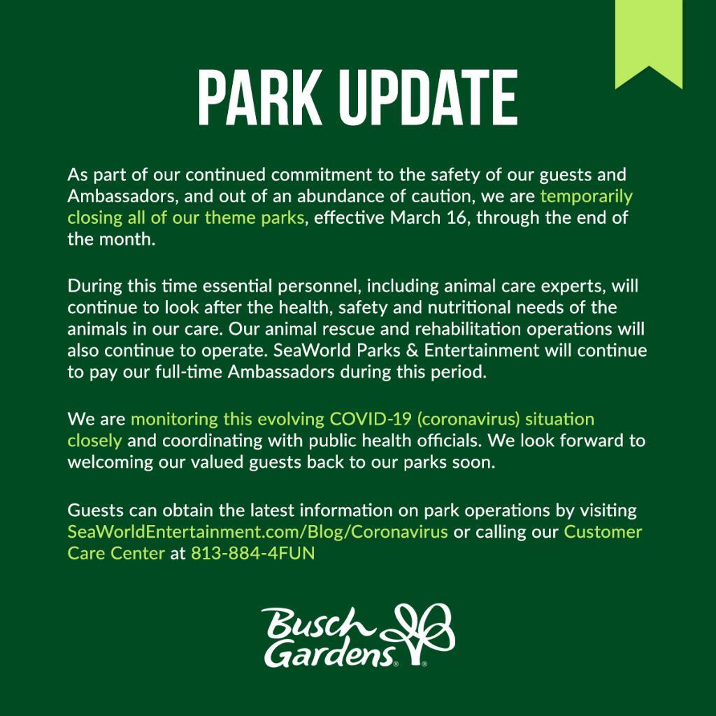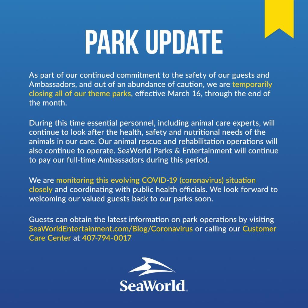 In some more Corona Virus related news after yesterdays announcements, all SeaWorld & Busch Gardens are closing from Monday the 16th until the end of the month.
